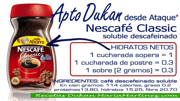 Los valores del Nescafé Descafeinado clásico son para cada 100 gramos: 15.25 g de hidratos y 20.70 de fibra, con 13.80 g de proteínas y 0.2 de grasa. Como un sobre tiene 2 gramos, tiene 0.3 hidratos. Al ser de tueste natural no lleva azúcar añadido. ¿De dónde he sacado esto? Como no vienen los valores ni en la caja ni en el bote me puse en contacto con Nescafé y le pedí los datos.