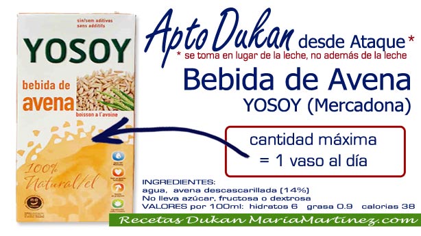 Para mi, cualquier marca de leche de avena que mejore los valores de la Bebida de avena ALPRO sería también apta para Dukan desde Ataque. Si eliges una marca que no añada goma gellan asegúrate de agitarla bien antes de abrir el envase porque suele hacer grumos (le pasa a la Bebida de Avena YOSOY)